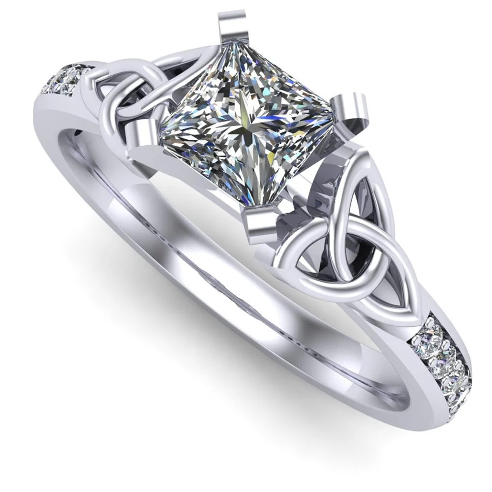 Solid 14K White Gold Irish Celtic Engagement Ring for Princess Cut Diamond