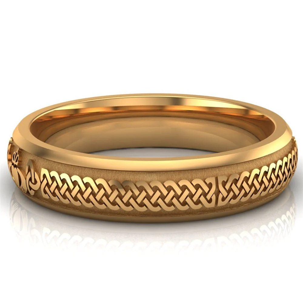 This Claddagh Wedding Ring showcases two Claddagh symbols—hands, heart, and crown—positioned opposite each other on the band, complemented by four trinity knots and four Celtic knots. The Celtic knot length is carefully tailored to the ring size, with smaller rings featuring proportionally shorter knots for a balanced and elegant design.