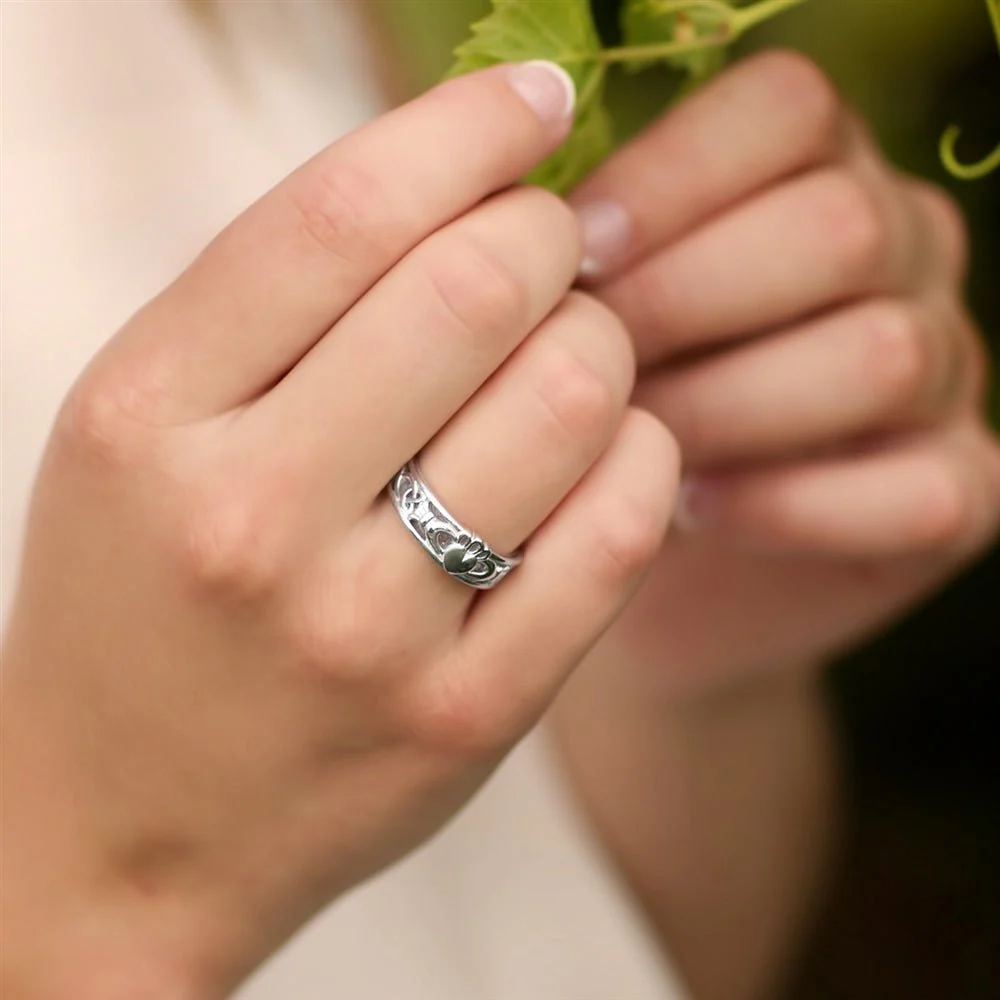 - A modern claddagh ring made of sterling silver, Hallmarked "925"