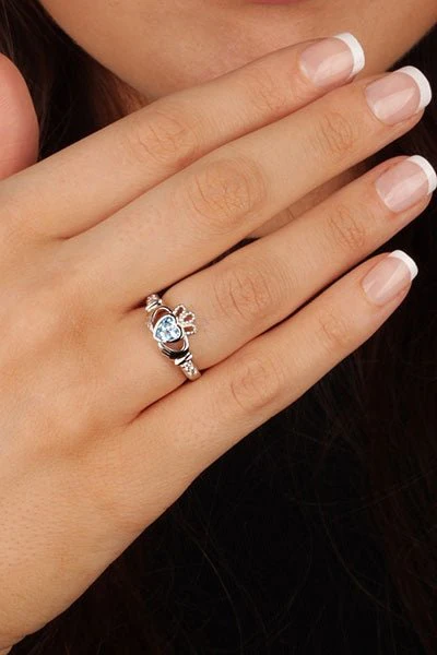 Sterling Silver March Birthstone (Aquamarine) Ladies Claddagh Ring